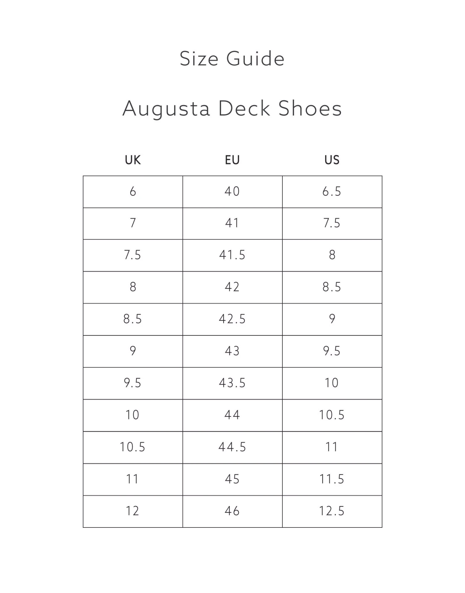 - UK 6 (EU 40), UK 7 (EU 41), UK 7.5 (EU 41.5), UK 8 (EU 42), UK 8.5 (EU 42.5), UK 9 (EU 43), UK 9.5 (EU 43.5), UK 10 (EU 44), UK 10.5 (EU 44.5), UK 11 (EU 45) & UK 12 (EU 46)