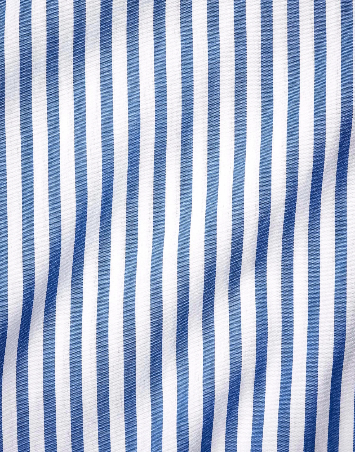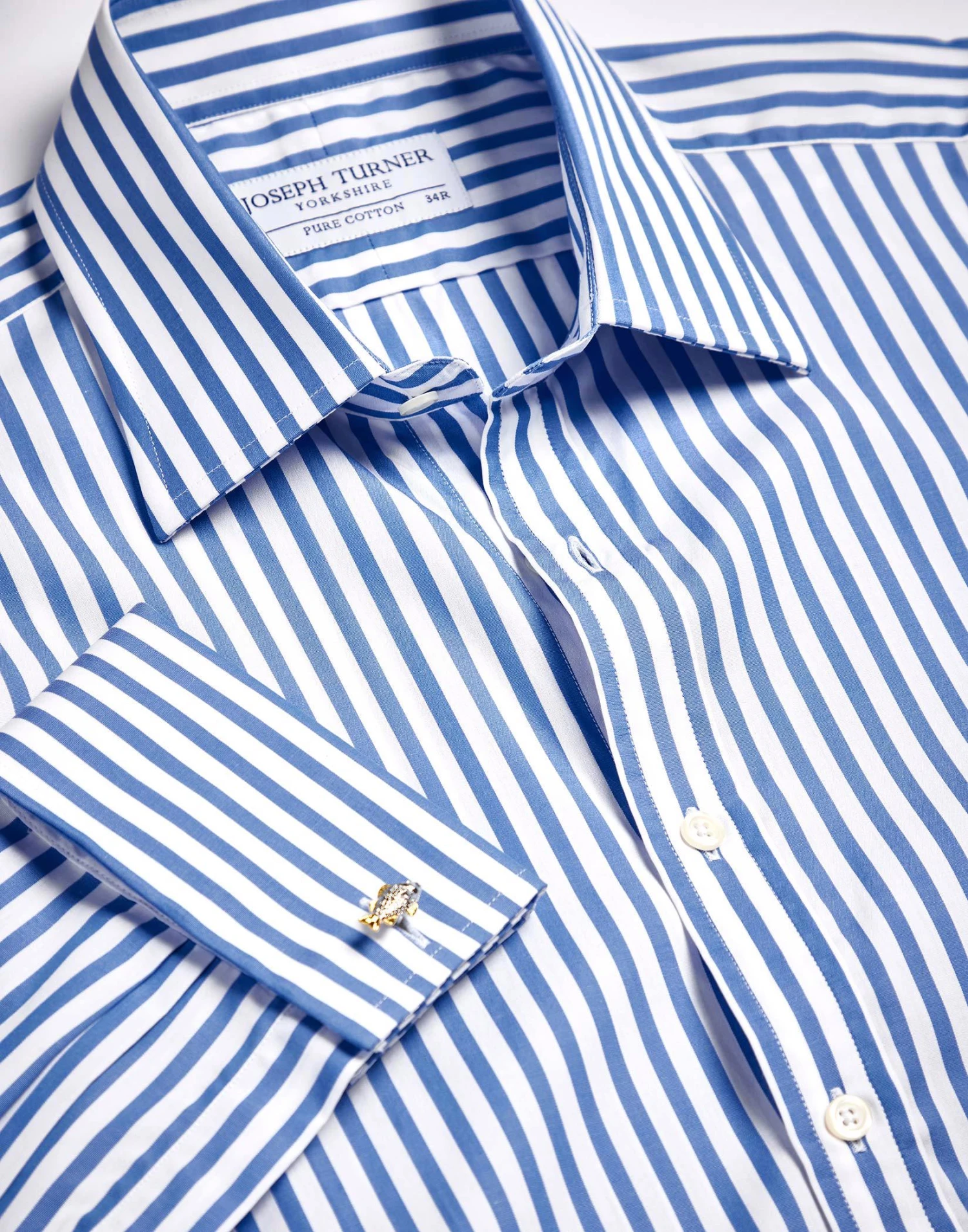 Crisp smart and comfortable this blue butcher stripe formal shirt is crafted with meticulous attention to detail using the finest two-fold cotton. Tailored to a classic fit for complete comfort featuring a split back yoke for ease of movement and with a choice of either single button cuffs or double cuffs for cufflinks. Team this blue stripe shirt with one of our pure silk ties and a pair of Joseph Turner cufflinks to finish off your look.