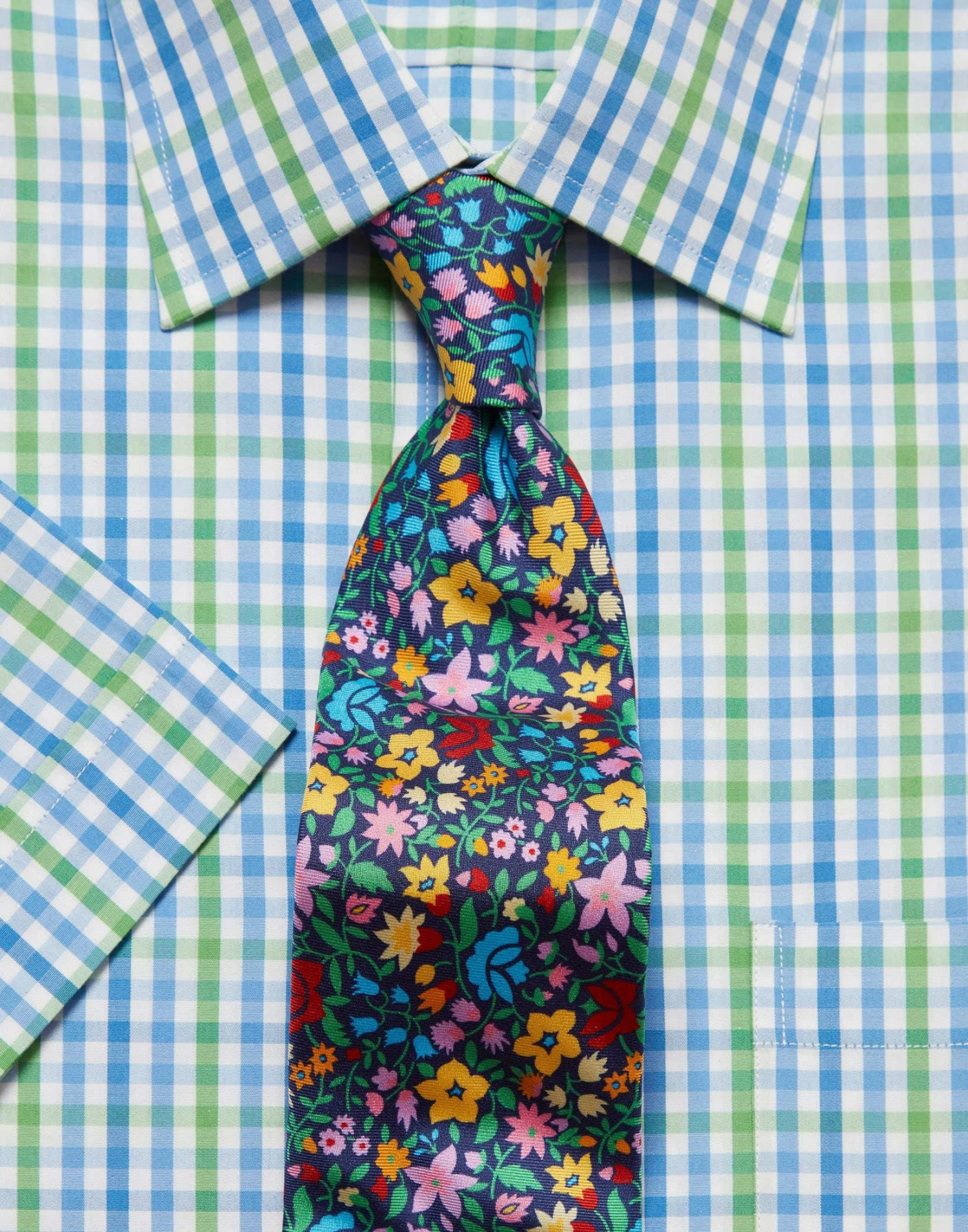 Stay smart as the temperature rises in one of our blue/green check short sleeve shirts. With neat turn-ups and a handy breast pocket it looks great when teamed with one of our pure silk ties.