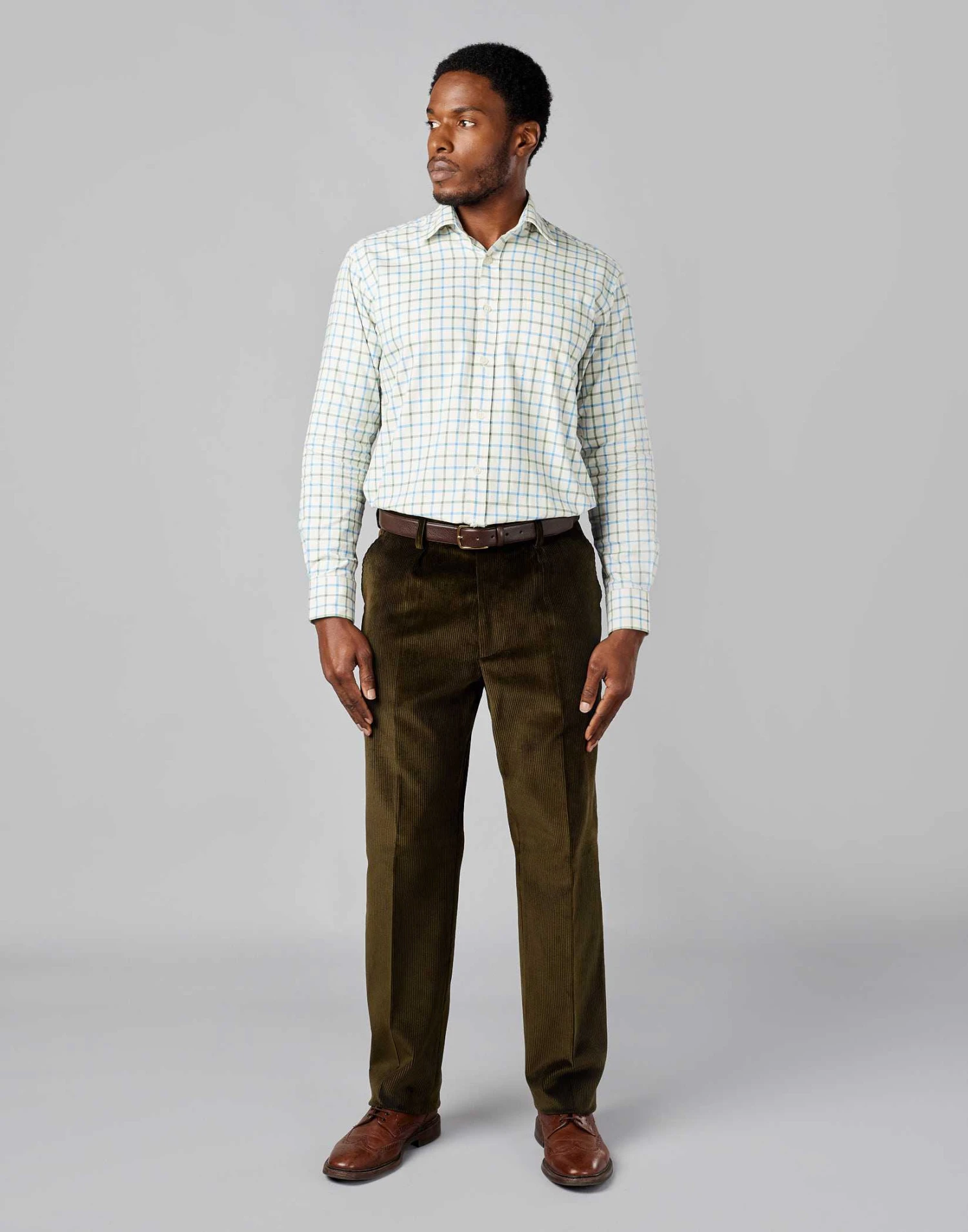 Woven by Italian mill Pontoglio, the 8-wale corduroy used to make these trousers is thick and robust providing warmth and durability wear after wear. The single forward pleats at the front offer extra comfort while creating a smart tailored look. Team a pair of these dark green cords with a tattersall check shirt and a pair of leather brogues to perfect the country look.