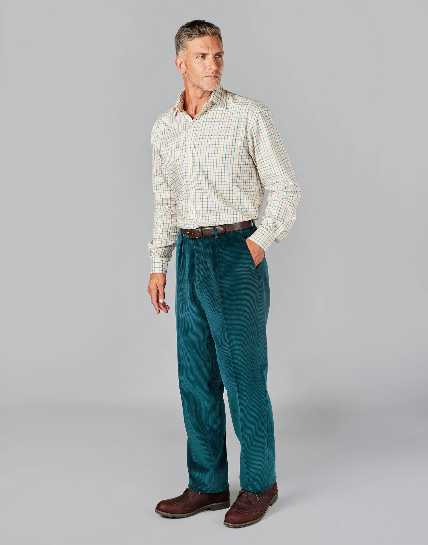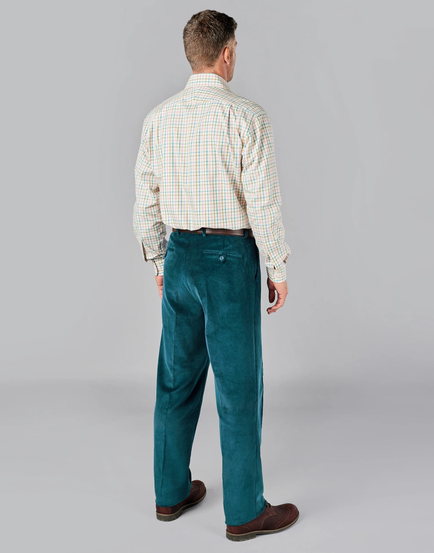 Woven by Italian mill Pontoglio, the 8-wale corduroy used to make these trousers is thick and robust providing warmth and durability wear after wear. The single forward pleats at the front offer extra comfort while creating a smart tailored look. Stand out in a pair of these teal cords and team with a tattersall check shirt and a pair of leather brogues to perfect the country look.