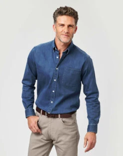 A classic relaxed style this hardwearing mid blue denim shirt with added stretch for comfort is perfect for easy off-duty days. Featuring a button-down collar and a handy breast pocket.