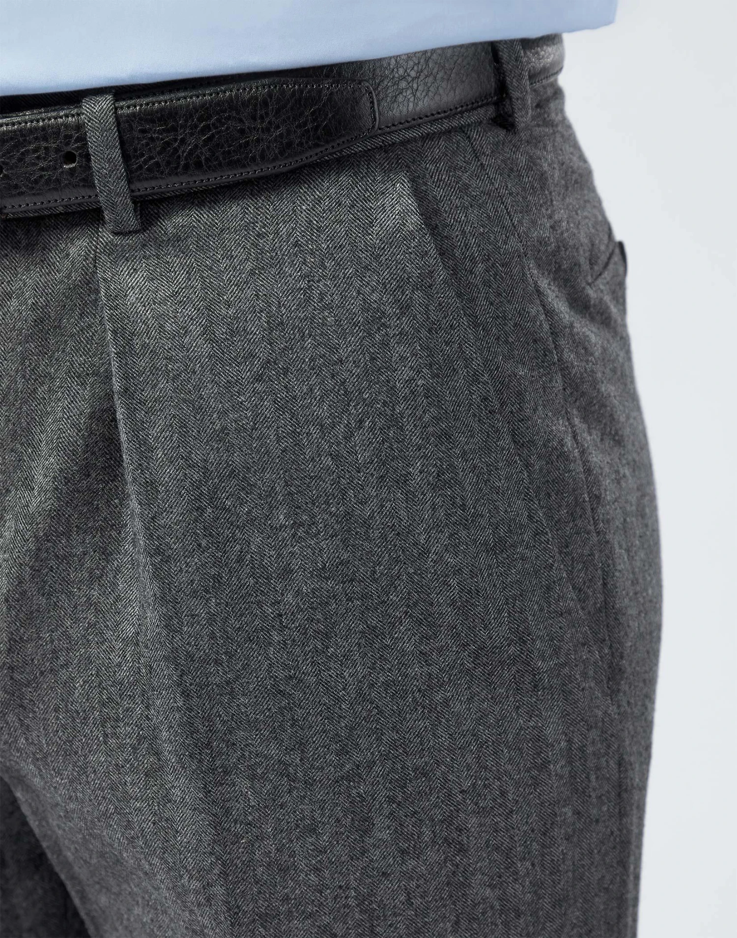 Cut from pure merino wool cloth that is woven in Yorkshire by the renowned family-run mill Alfred Brown our flannel trousers are the perfect choice for those who appreciate the finer things in life. Featuring single forward pleats at the front to create a tailored and sophisticated look and handy side and rear pockets our flannel trousers are a must-have for every man’s wardrobe. In a grey herringbone design these smart trousers work well with contrasting knitwear in cashmere or merino.
