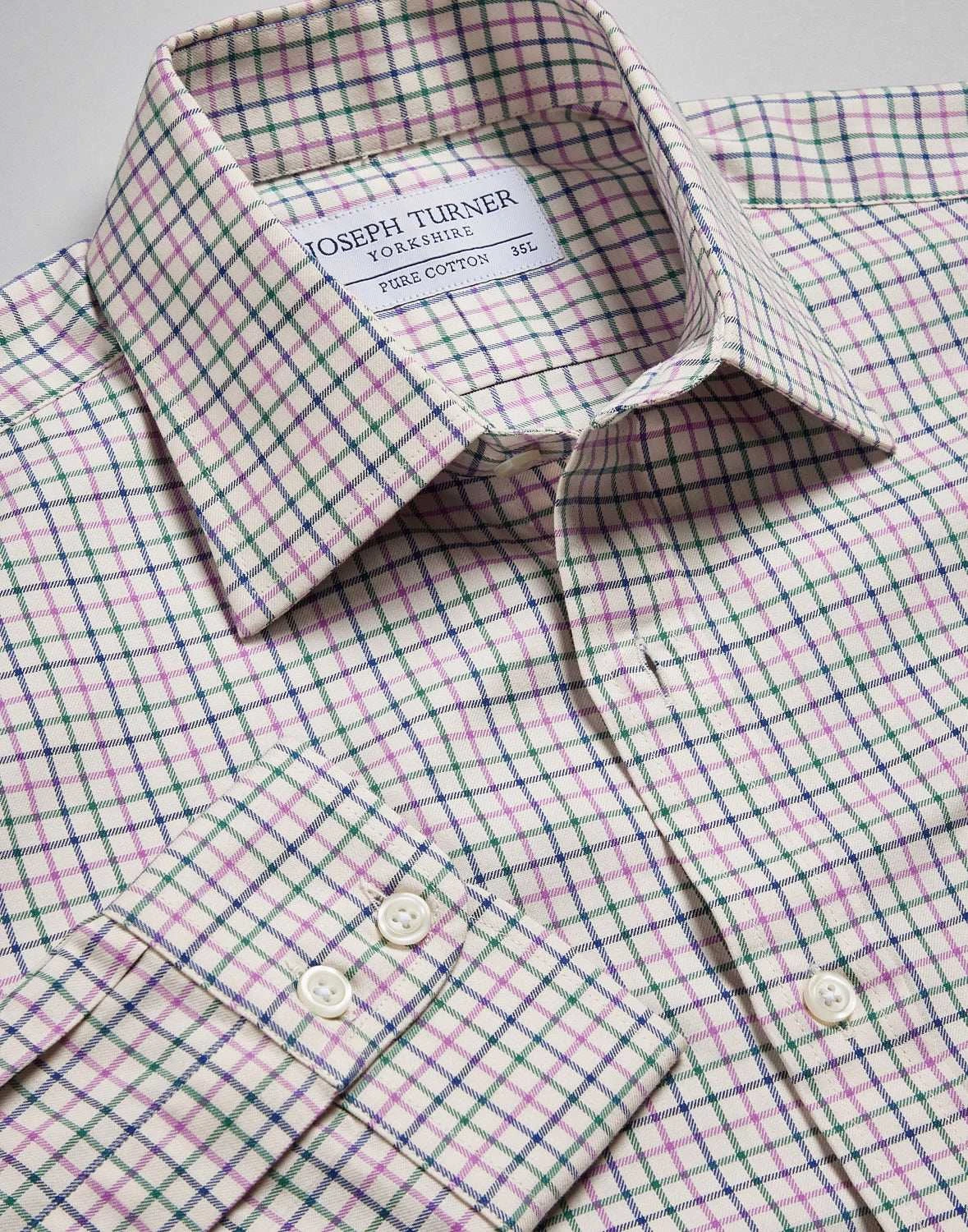 Perfect the British country style in one of our heritage tattersall shirts featuring a green purple & navy narrow check design. Tailored from pure brushed cotton twill with a two-piece collar and a split back yoke for a smooth fit this classic men’s country shirt will look just the part teamed with corduroy trousers and a pair of country brogues.