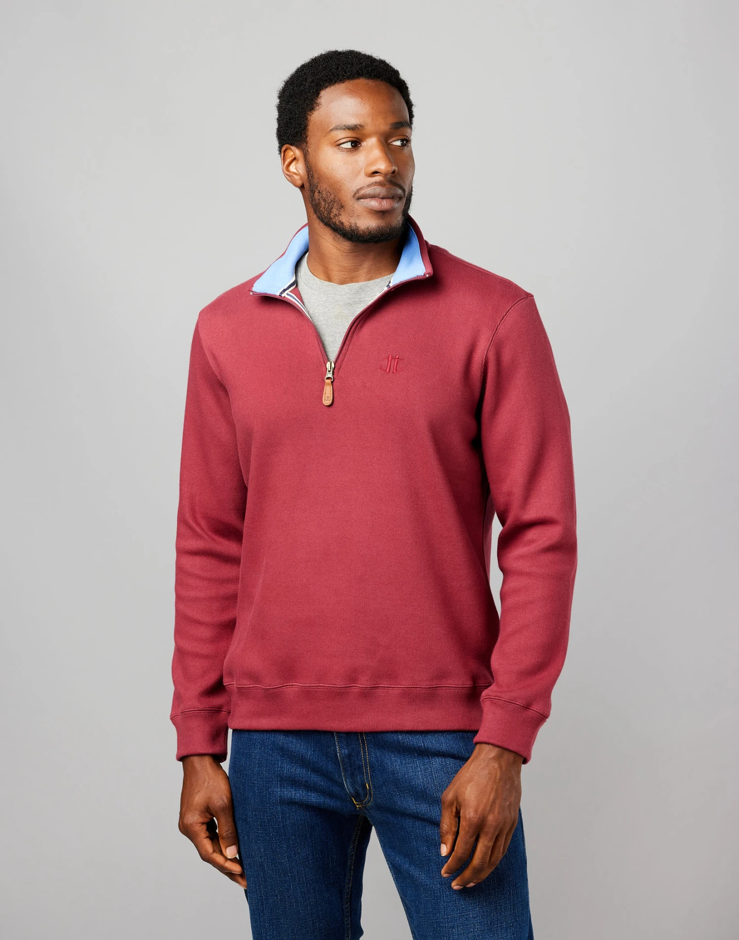 Made from 100% cotton our half-zip jersey sweatshirt offers superior comfort and natural softness that feels gentle against your skin. The contrast inner trim detailing adds visual interest to this timeless wardrobe staple. Layer our burgundy sweatshirt over a crisp white t-shirt and add a pair of dark blue denim jeans for a relaxed and sporty look.