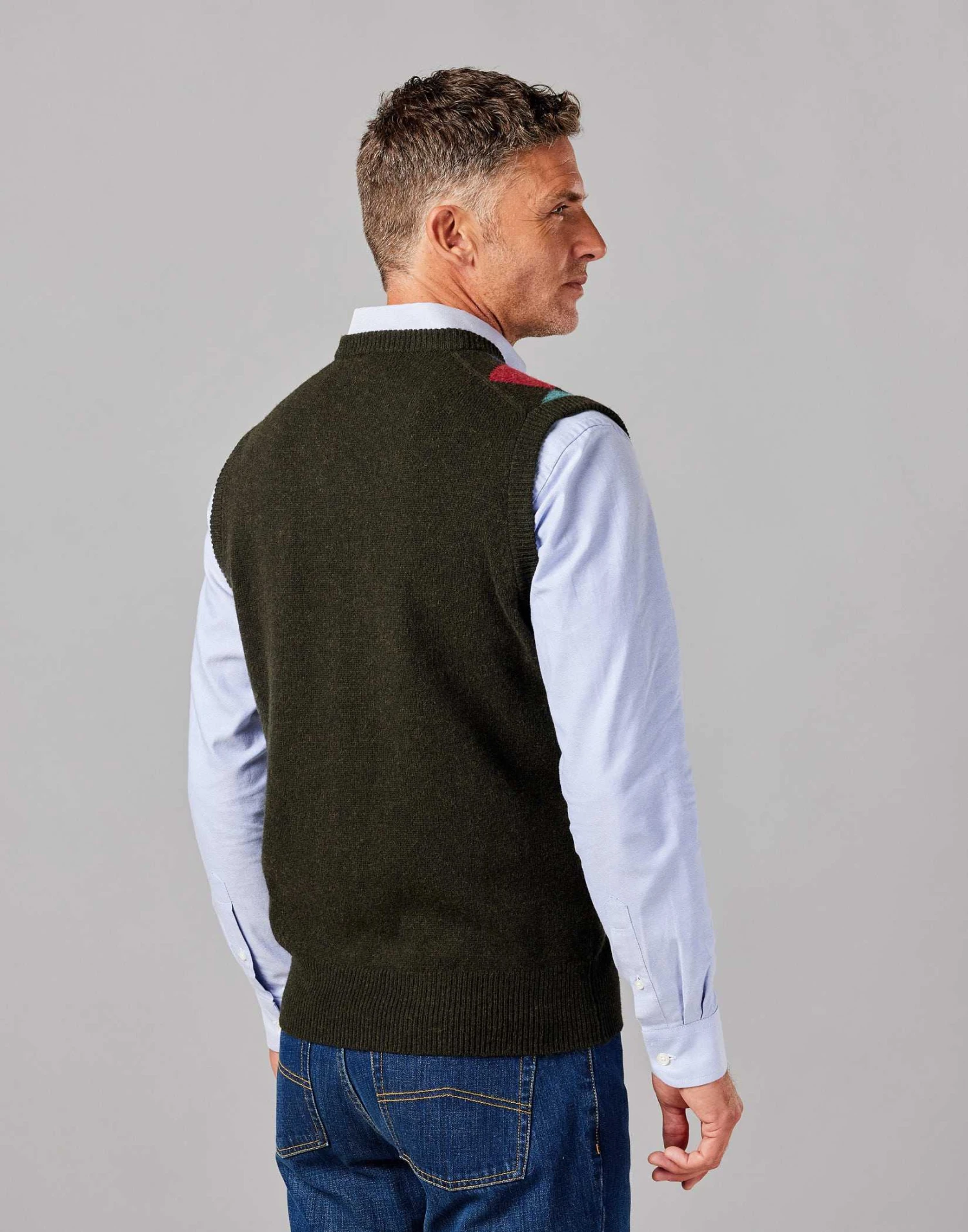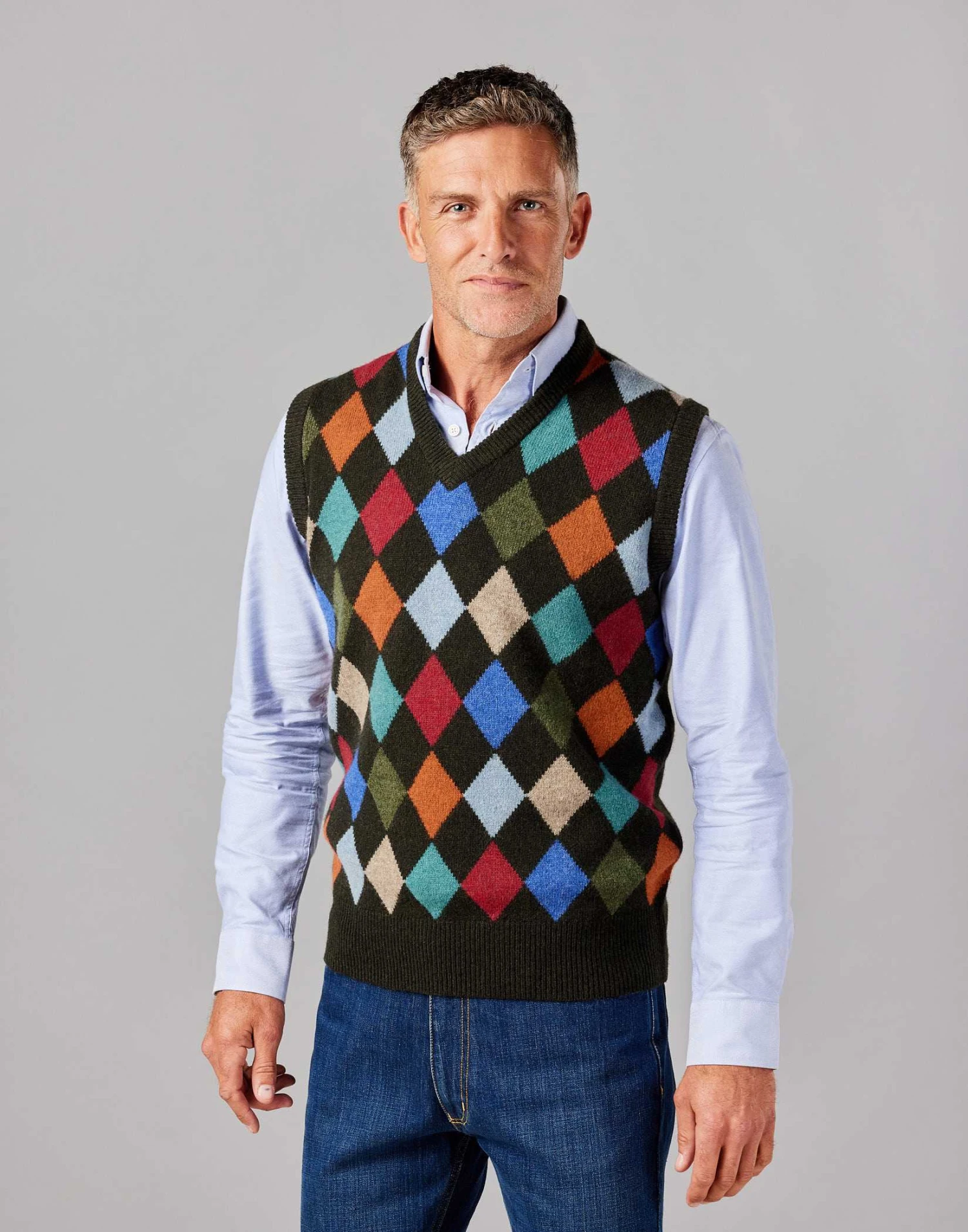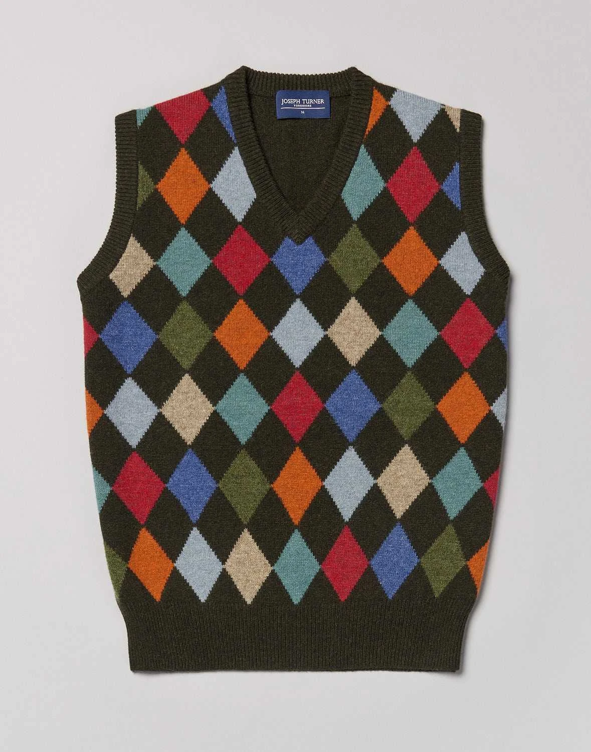 Let your personality shine with our Harlequin jumper a true showstopper that will add a lively touch to your wardrobe. With its eye-catching diamond design and bold colours this slipover jumper is designed to make a statement and turn heads. Layer it under a blazer for a polished and refined look and wait for the compliments to roll in.