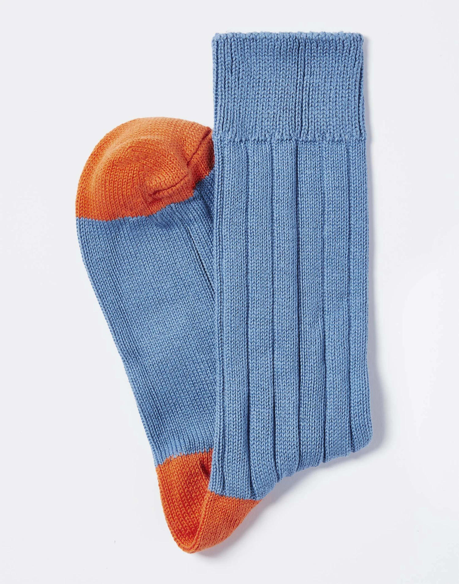Our men’s heel & toe socks in cornflower blue with a contrast orange heel & toe design are made in Britain using the finest quality yarns and are finished with hand-linked toes for extra comfort wear after wear.
