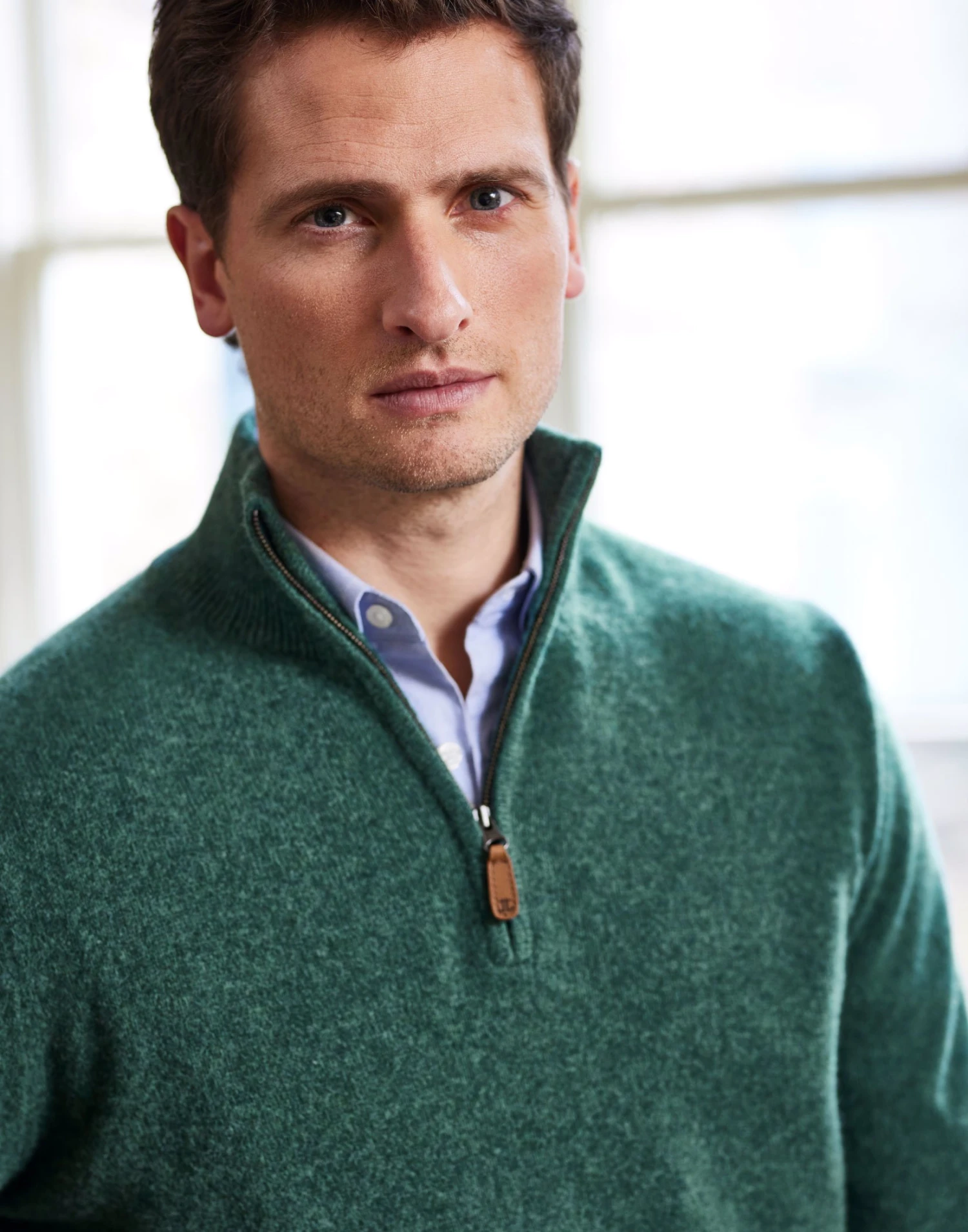 The signature feel and warmth of our lambswool half-zip jumpers comes from the combination of superior raw materials and spinning techniques used by our suppliers. A stylish wardrobe staple this men’s pure lambswool half-zip in a handsome shade of green will add a touch of luxury to your everyday style.
