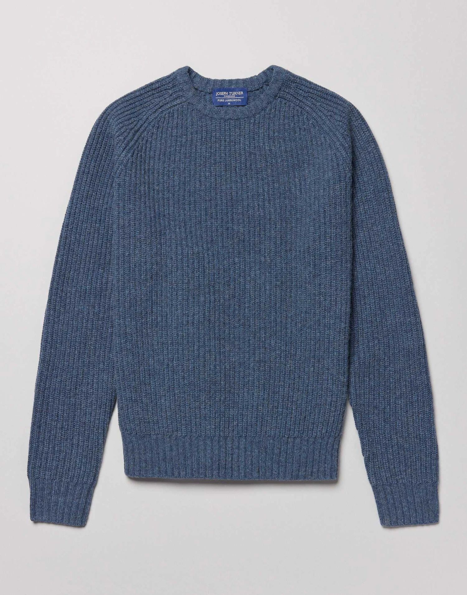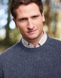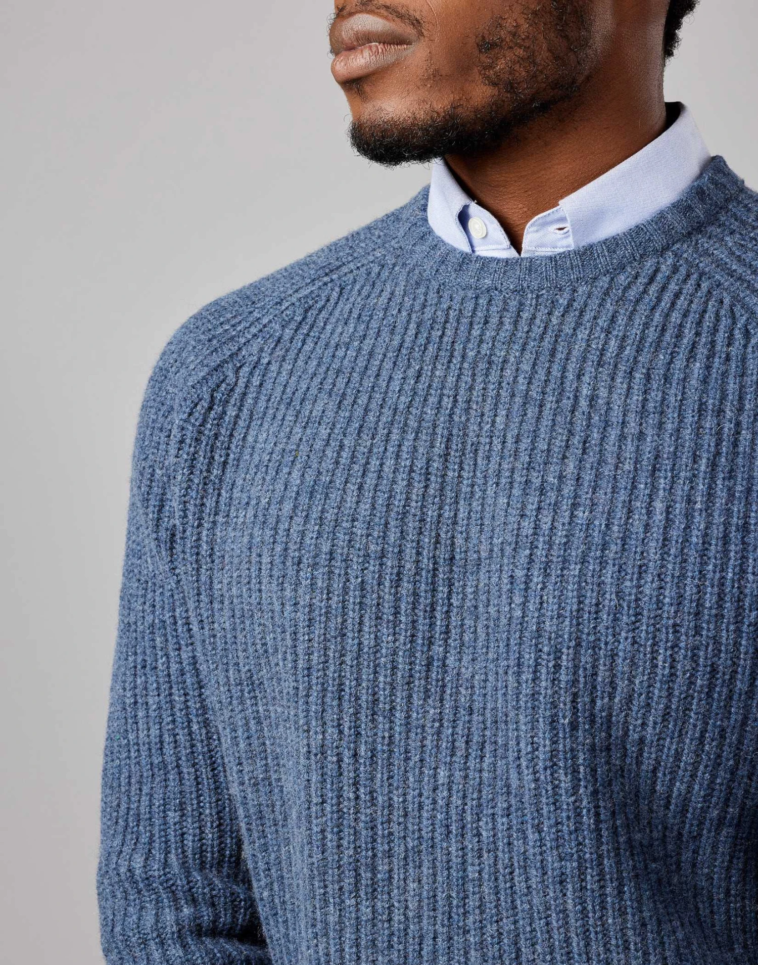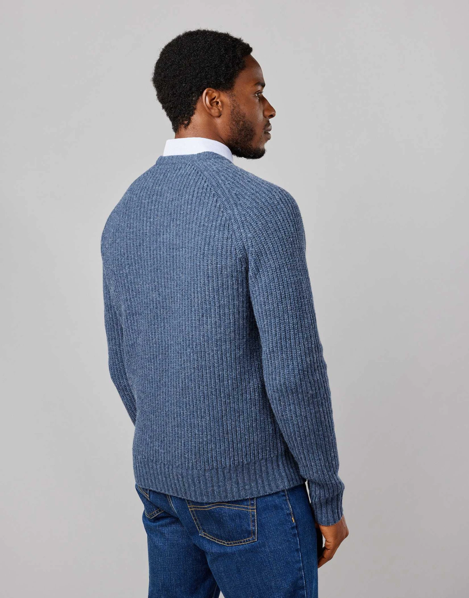 Brace against coastal chills in our timeless and substantial Fisherman’s rib knitwear. Knitted in a robust 5-gauge knit our men’s Whitby Rib crew neck Jumper is designed to withstand the elements and ensures warmth and comfort throughout the winter season. The ribbed texture adds depth and character to its classic crew neck design combining traditional craftsmanship with modern style. Layer this blue Whitby rib jumper over a brushed cotton check or a denim shirt for a rugged outdoor-inspired look. Fits slightly closer to the body than our other knitwear styles.