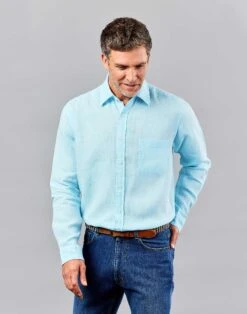 Instantly soft and relaxed with a beautiful natural texture our best-selling pure linen long sleeve shirts will keep you cool fresh and looking effortlessly stylish in the heat. Wear this eye-catching aqua linen shirt with a pair of twill shorts to keep cool in the day or smarten up with cotton chinos in the evening.