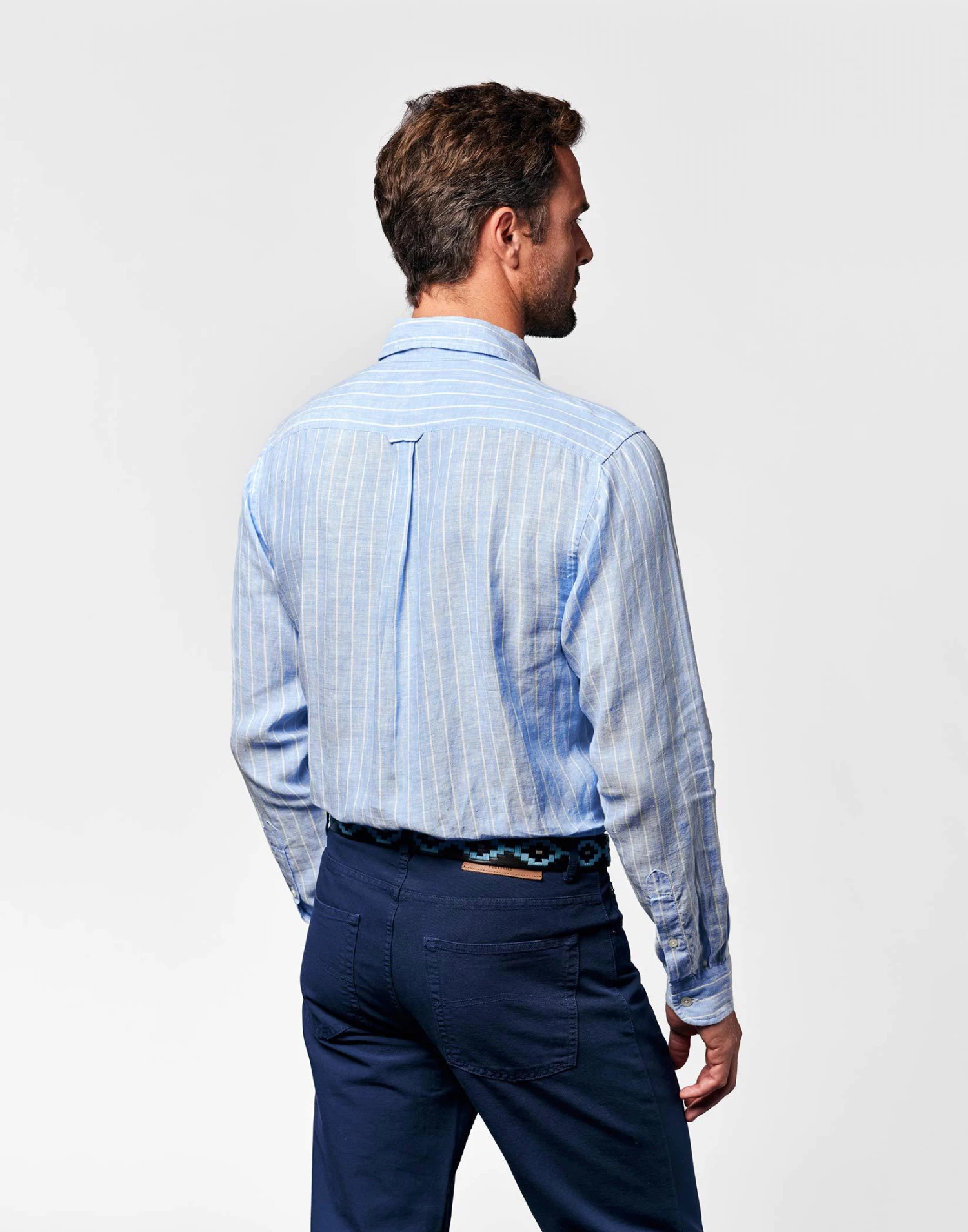 Instantly soft and relaxed with a beautiful natural texture our best-selling pure linen long sleeve shirts will keep you cool fresh and looking effortlessly stylish in the heat. Wear this smart blue & white stripe linen shirt with a pair of twill shorts to keep cool in the day or smarten up with navy cotton chinos in the evening.