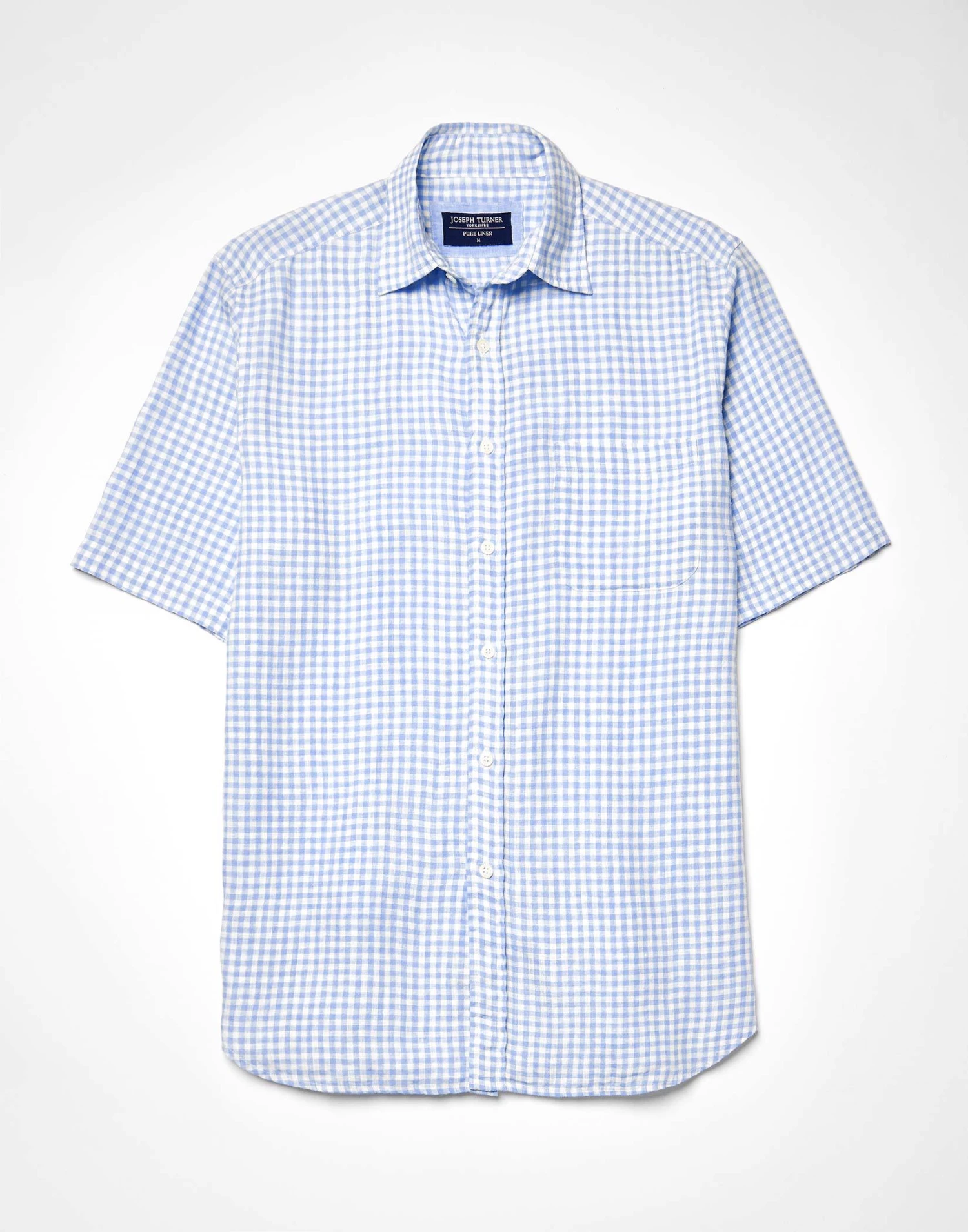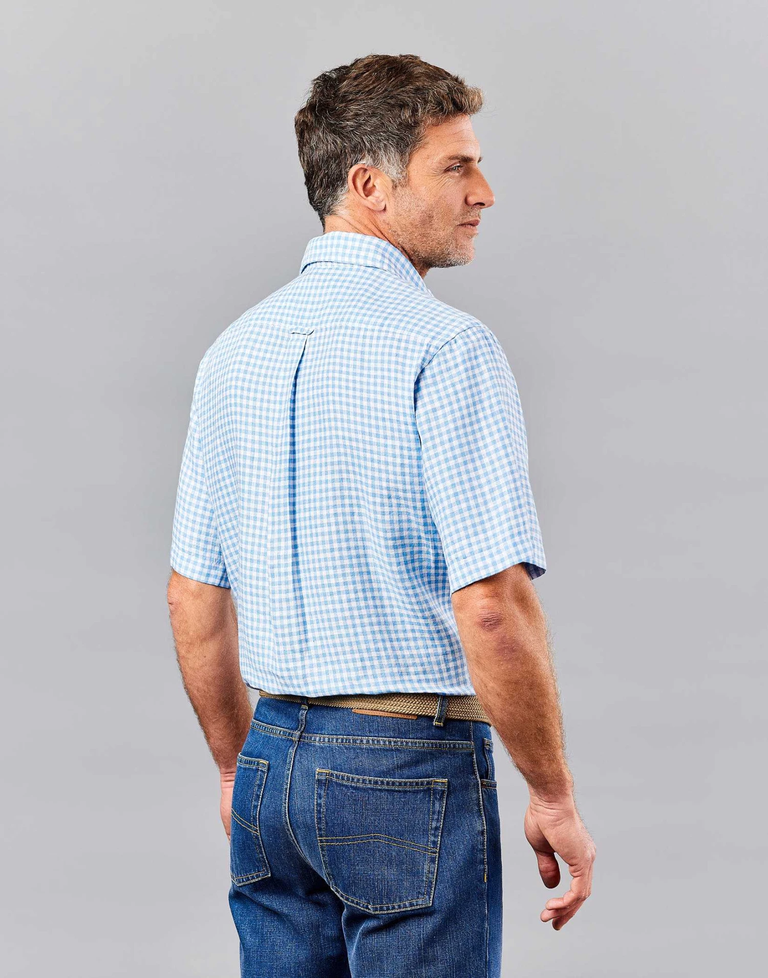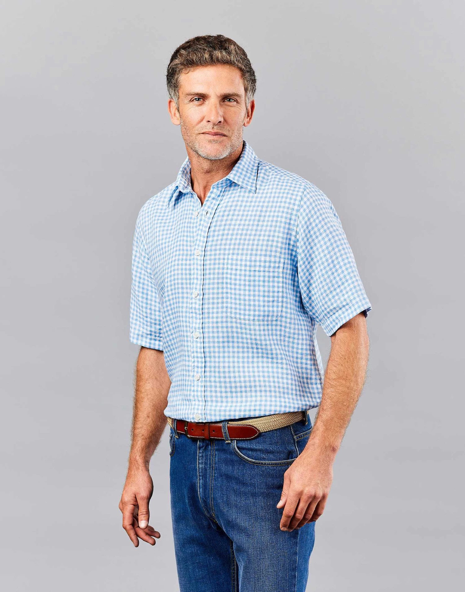 Instantly soft and relaxed with a beautiful natural texture our best-selling pure linen short sleeve shirts will keep you cool fresh and looking effortlessly stylish in the heat. Wear this sky blue gingham check linen shirt with a pair of twill shorts to keep cool in the day or smarten up with navy cotton chinos in the evening.