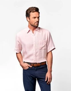 Instantly soft and relaxed with a beautiful natural texture our best-selling pure linen short sleeve shirts will keep you cool fresh and looking effortlessly stylish in the heat. Wear this eye-catching pink linen shirt with a pair of twill shorts to keep cool in the day or smarten up with navy cotton chinos in the evening.