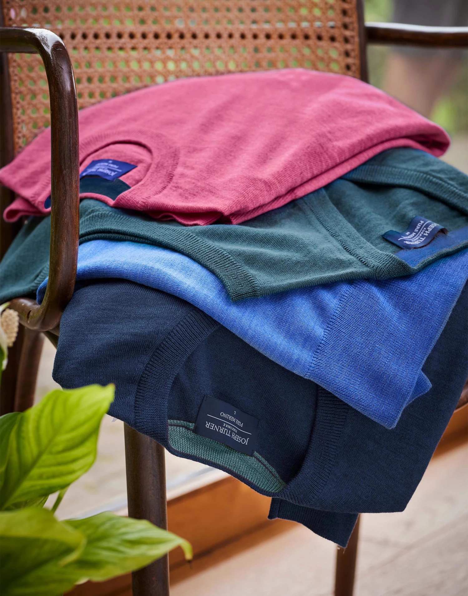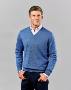 A luxurious extra fine merino v-neck jumper with natural lustre perfect drape and crease resistance. In a handsome shade of cornflower blue this men’s merino v-neck jumper is a classic wardrobe staple that will spruce up any smart-casual outfit.