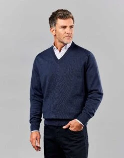 A luxurious extra fine merino v-neck jumper with natural lustre perfect drape and crease resistance. In a classic dark blue this men’s merino v-neck jumper is a timeless wardrobe staple that will spruce up any smart-casual outfit.