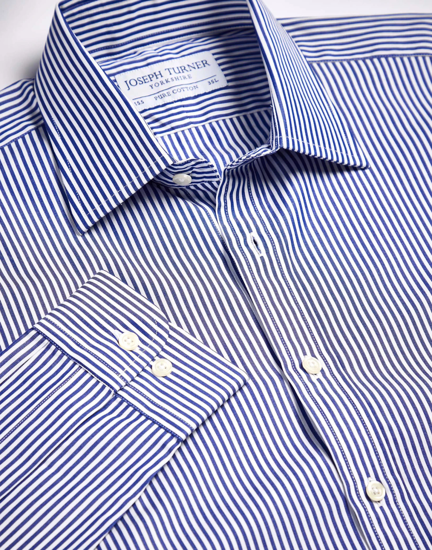 Crisp smart and comfortable this navy Bengal stripe formal shirt is crafted with meticulous attention to detail using the finest two-fold cotton. Tailored to a classic fit for complete comfort featuring a split back yoke for ease of movement and with a choice of either single button cuffs or double cuffs for cufflinks. Team this navy stripe shirt with one of our pure silk ties and a pair of Joseph Turner cufflinks to finish off your look.