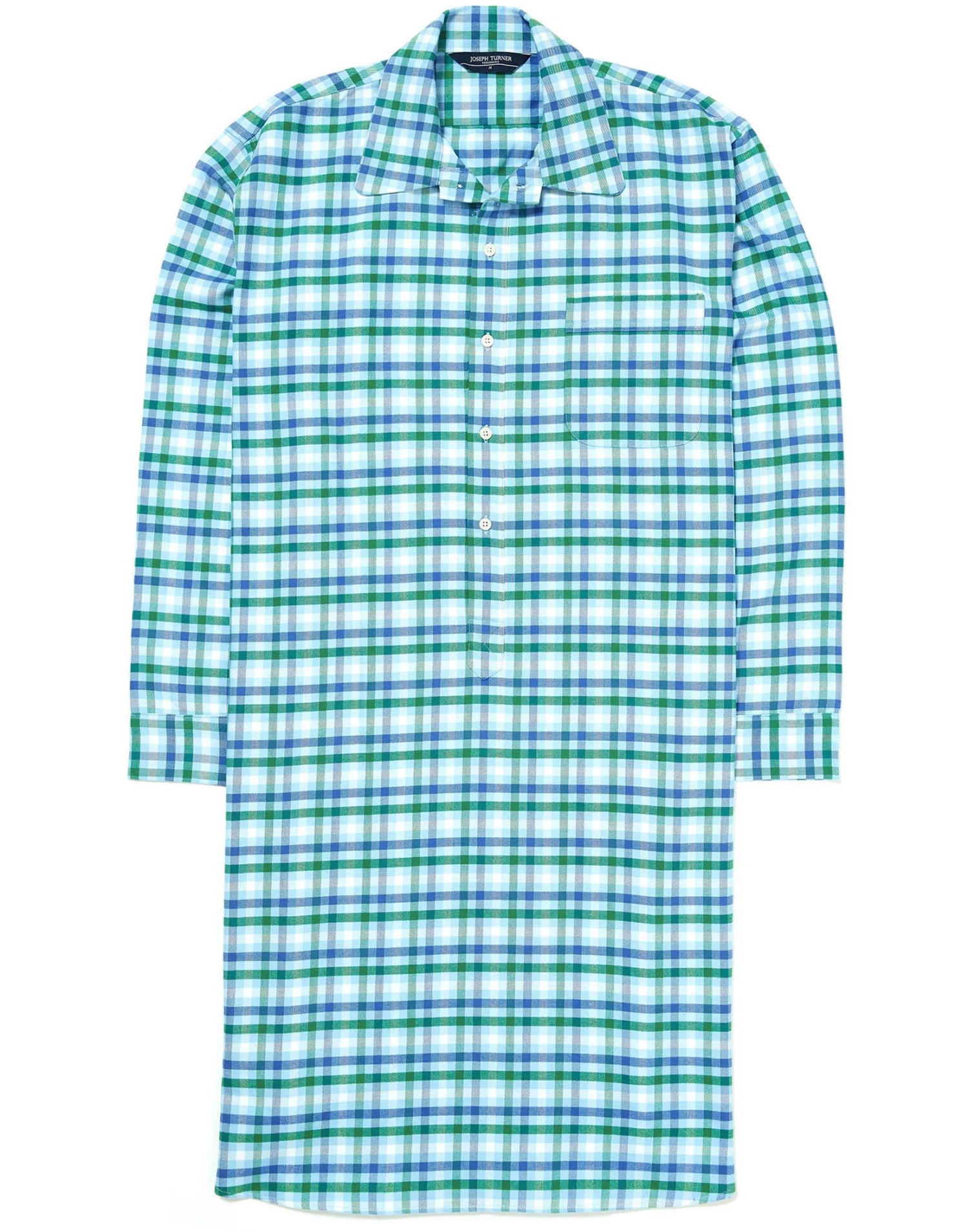 Made from 100% brushed cotton these wonderfully soft men’s nightshirts offer exceptional breathability and softness. Designed in a traditional blue & green check they evoke a sense of classic elegance and sophistication while the loose and relaxed fit provides freedom of movement for a comfortable and restful night’s sleep.
