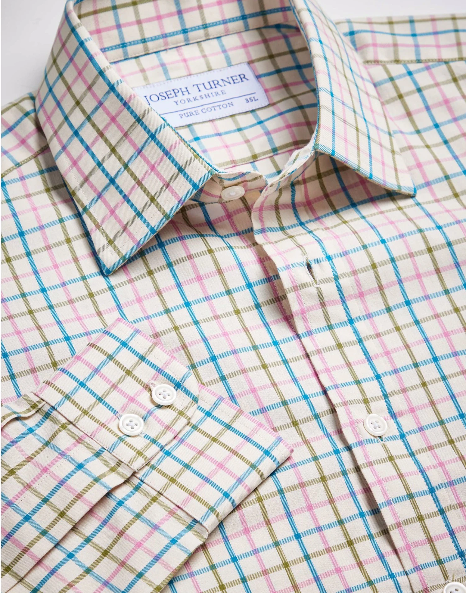 Perfect the British country style in one of our heritage tattersall shirts featuring an eye-catching olive pink & turquoise narrow check design. Tailored from pure brushed cotton twill with a two-piece collar and a split back yoke for a smooth fit this classic men’s country shirt will look just the part teamed with corduroy trousers and a pair of country brogues.