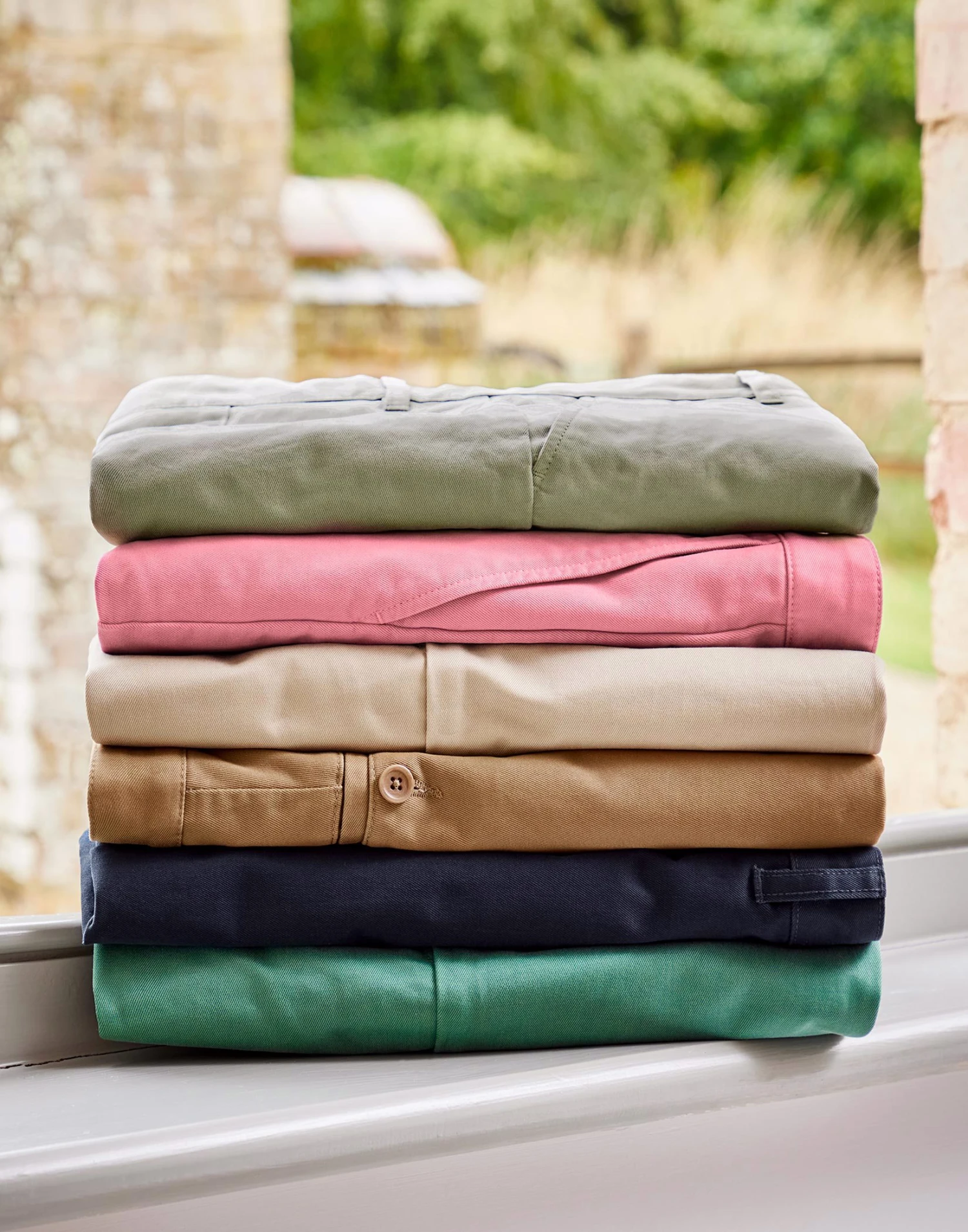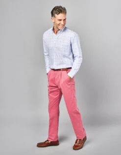 A cornerstone of smart-casual style cotton chinos are an essential component of every man’s wardrobe. Our men’s pleat front chinos in an eye-catching pink are a great starting point for any outfit. Made from pure washed cotton twill with a classic cut these look great teamed with a casual check shirt and your favourite pair of leather deck shoes.
