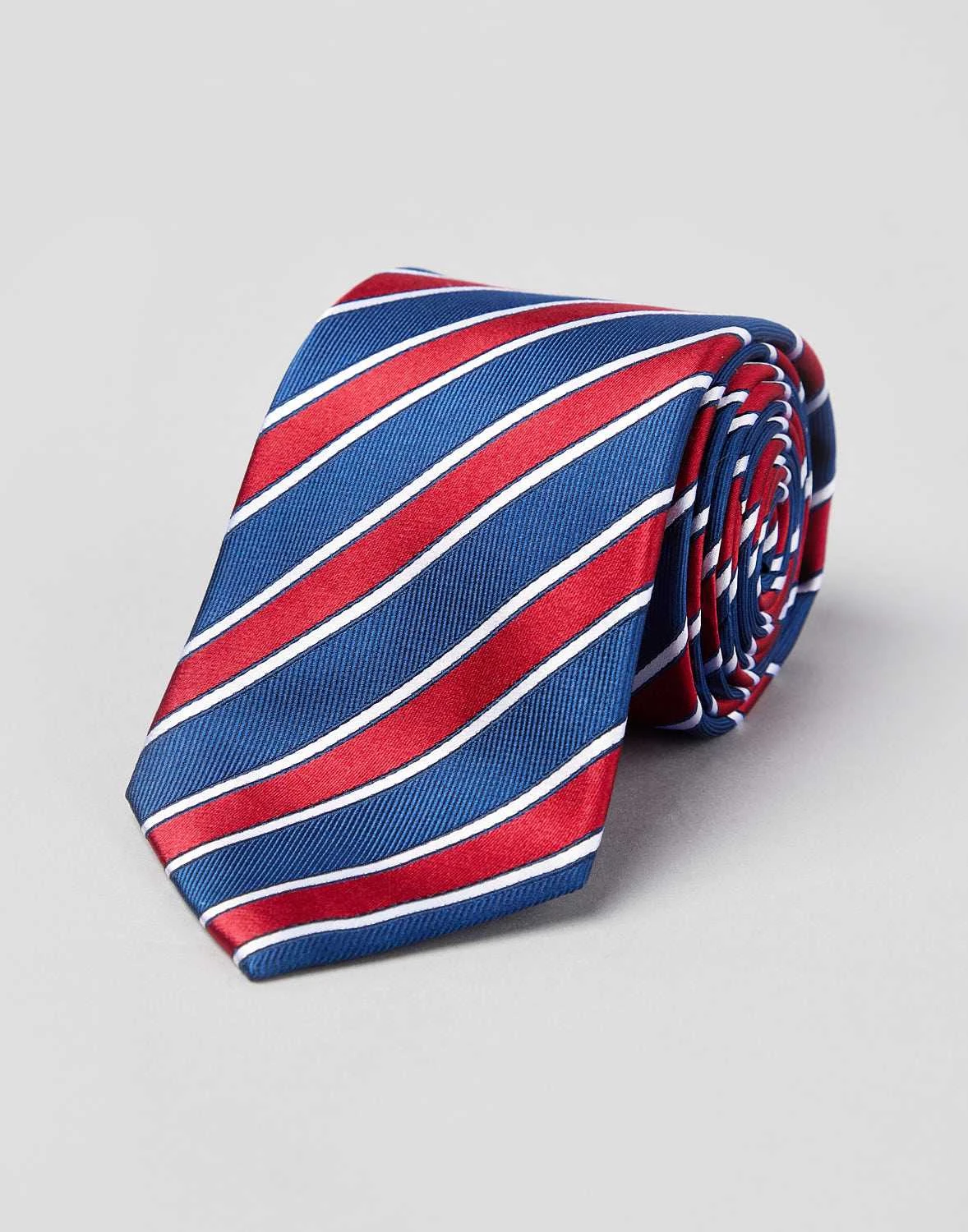 Add a little personality to your formal wardrobe with this woven silk tie in a bold red and navy stripe design. Made from 100% silk and hand-finished for lasting quality. Whether you’re attending a business meeting or a special occasion this handsome silk tie is the perfect choice to showcase your refined taste and impeccable style.