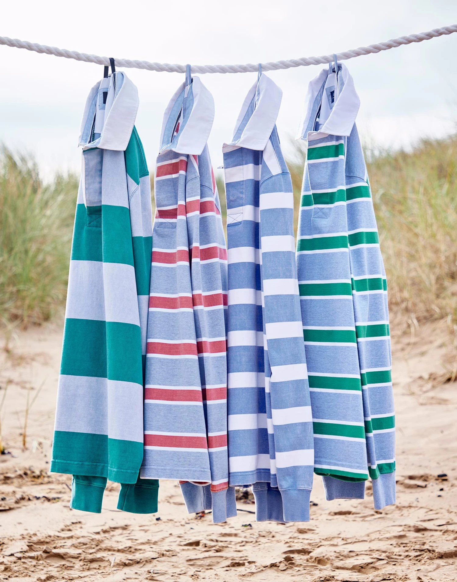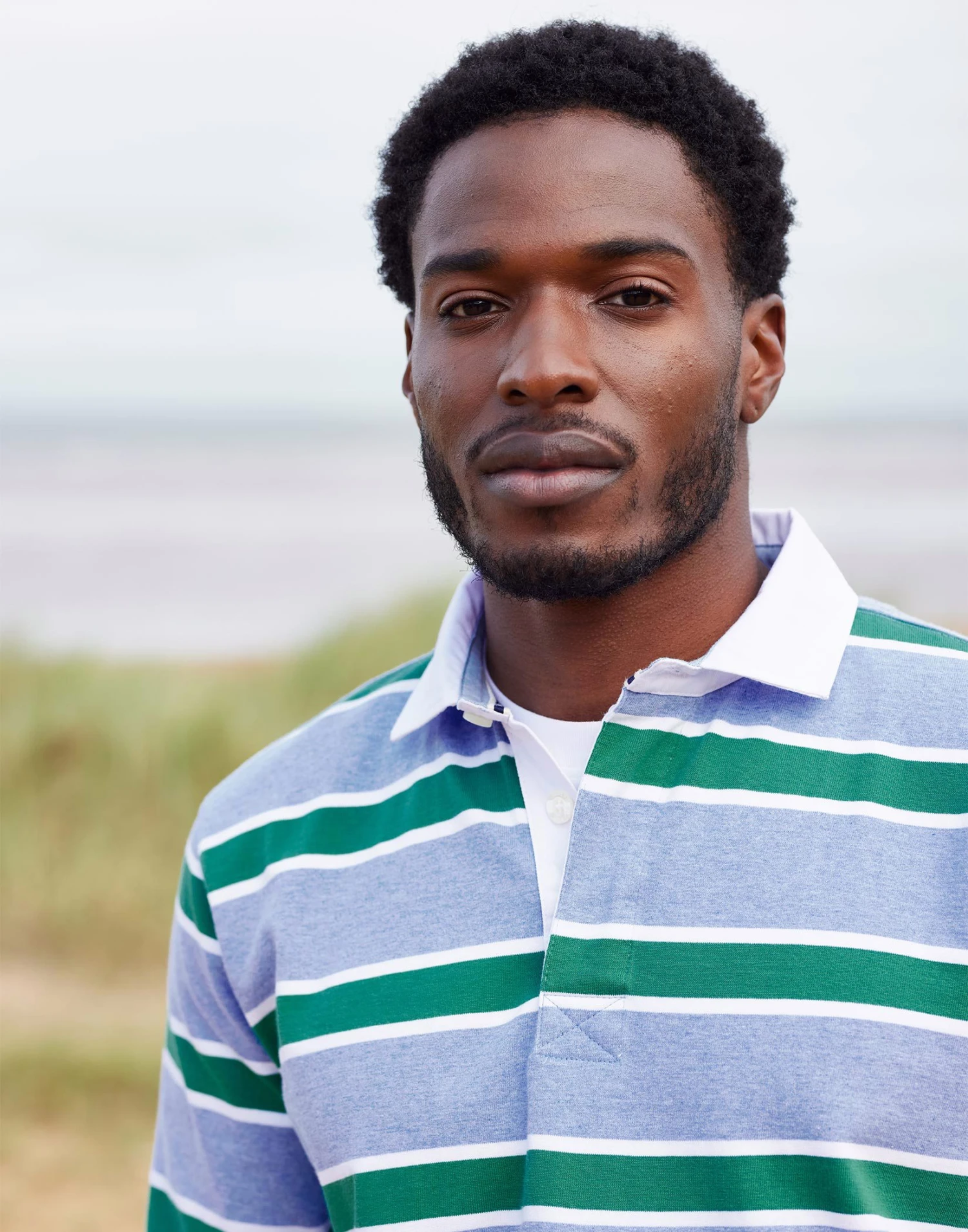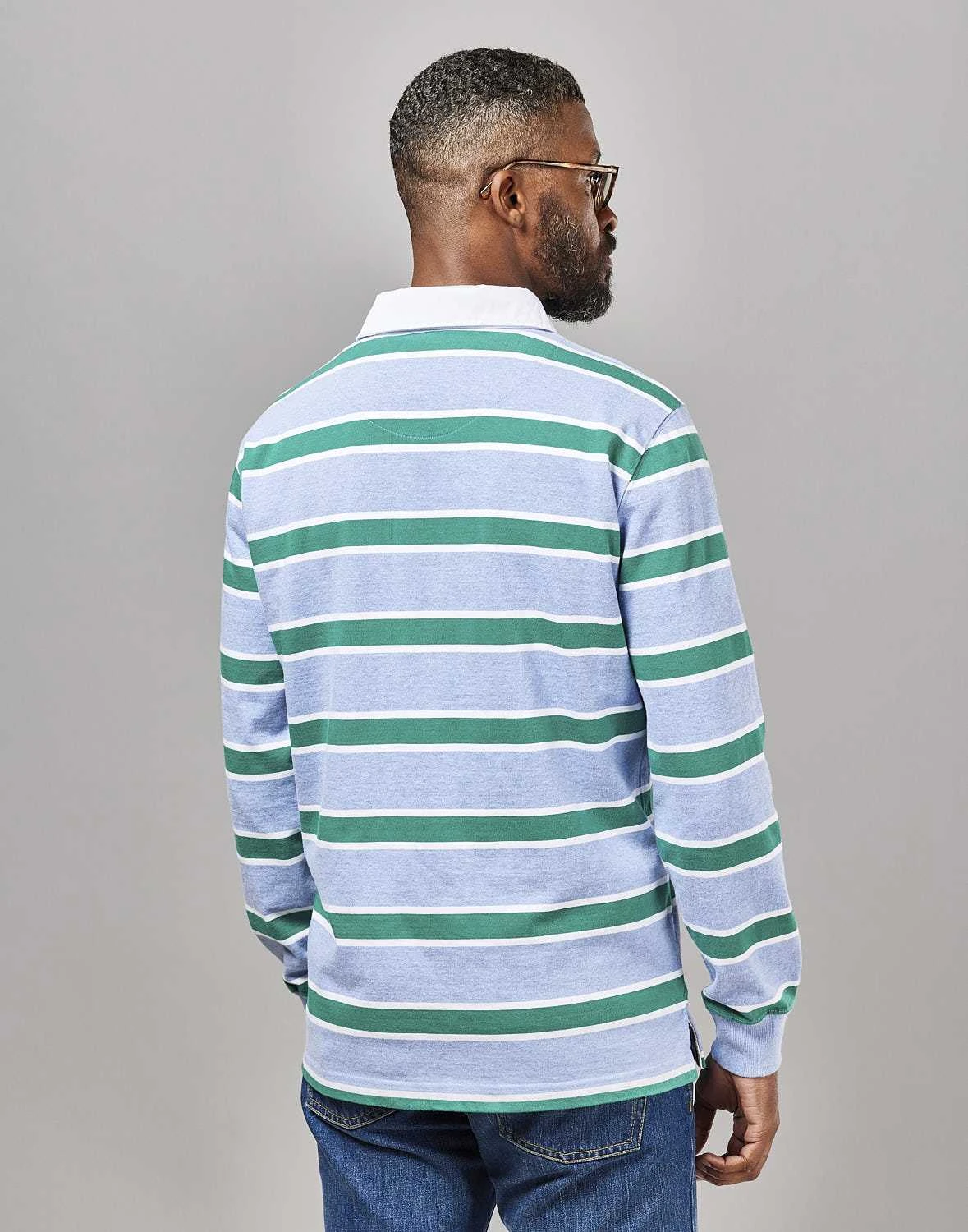 Our classic men’s rugby shirt in a sky & green stripe is made from beautifully soft cotton jersey with superior detailing that’s built to last.