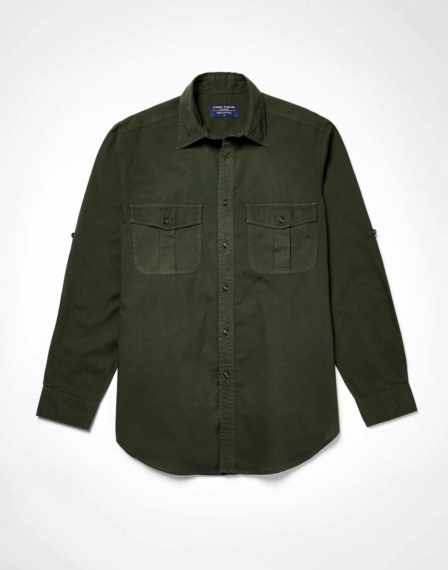 Our men’s dark olive Safari shirt with button tabs for rolled up sleeves and two button-down breast pockets is a practical yet stylish addition to your warm-weather wardrobe.