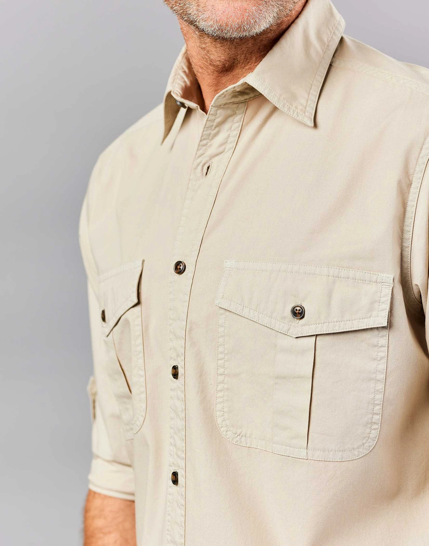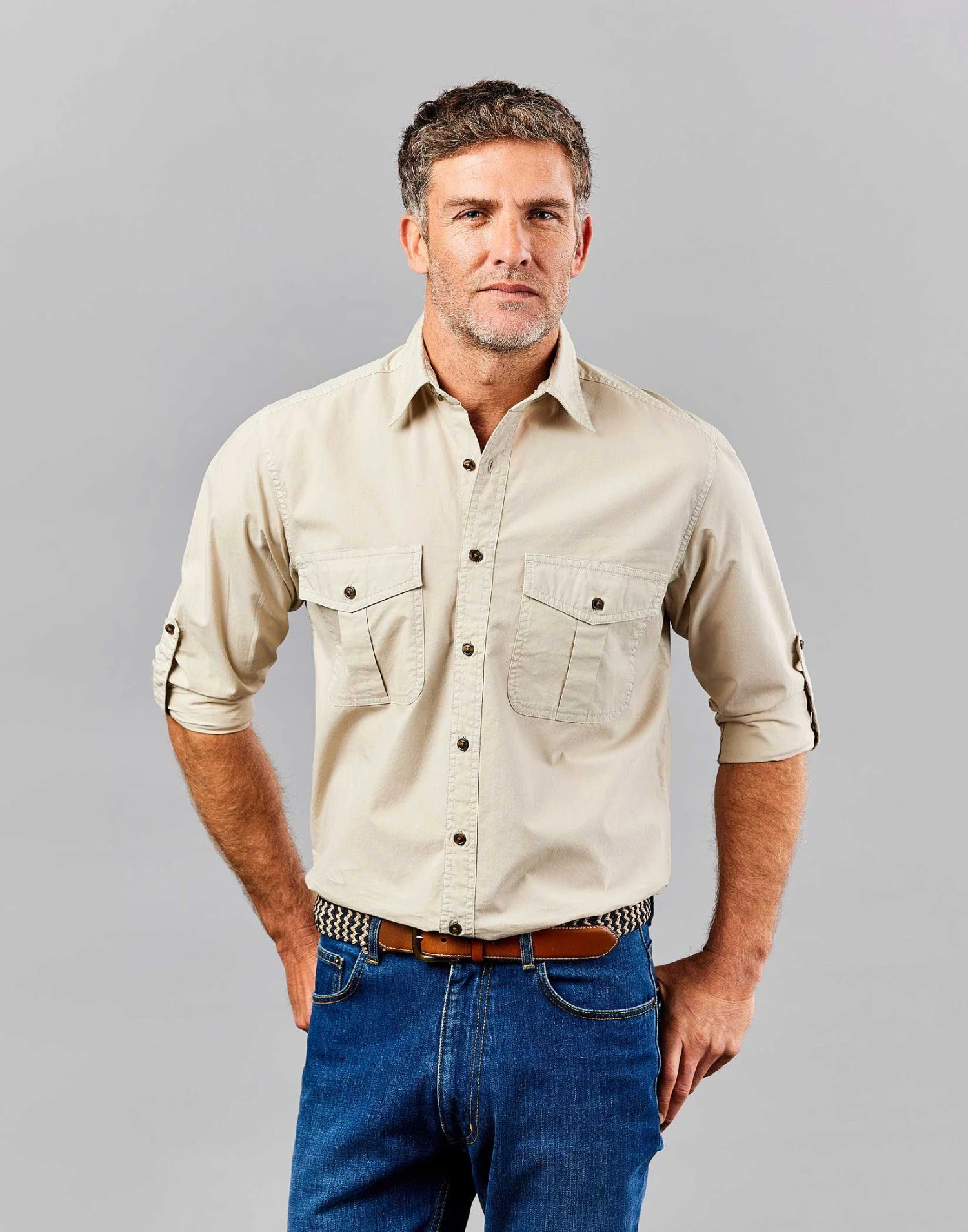 Our men’s stone Safari shirt with button tabs for rolled up sleeves and two button-down breast pockets is a practical yet stylish addition to your warm-weather wardrobe.
