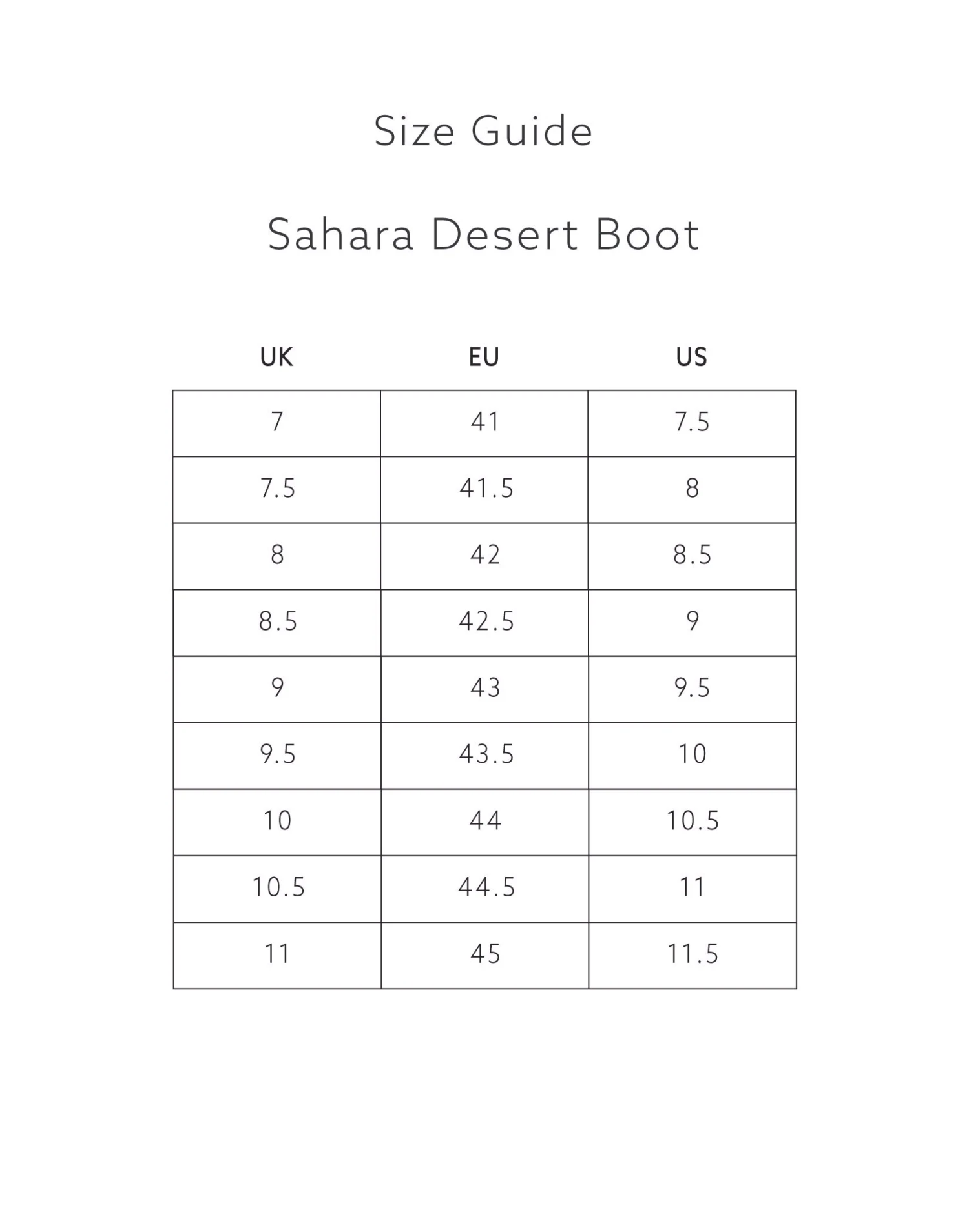 - UK 7 (EU 41), UK 7.5 (EU 41.5), UK 8 (EU 42), UK 8.5 (EU 42.5) UK 9 (EU 43), UK 9.5 (EU 43.5), UK 10 (EU 44), UK 10.5 (EU 44.5)& UK 11 (EU 45)
