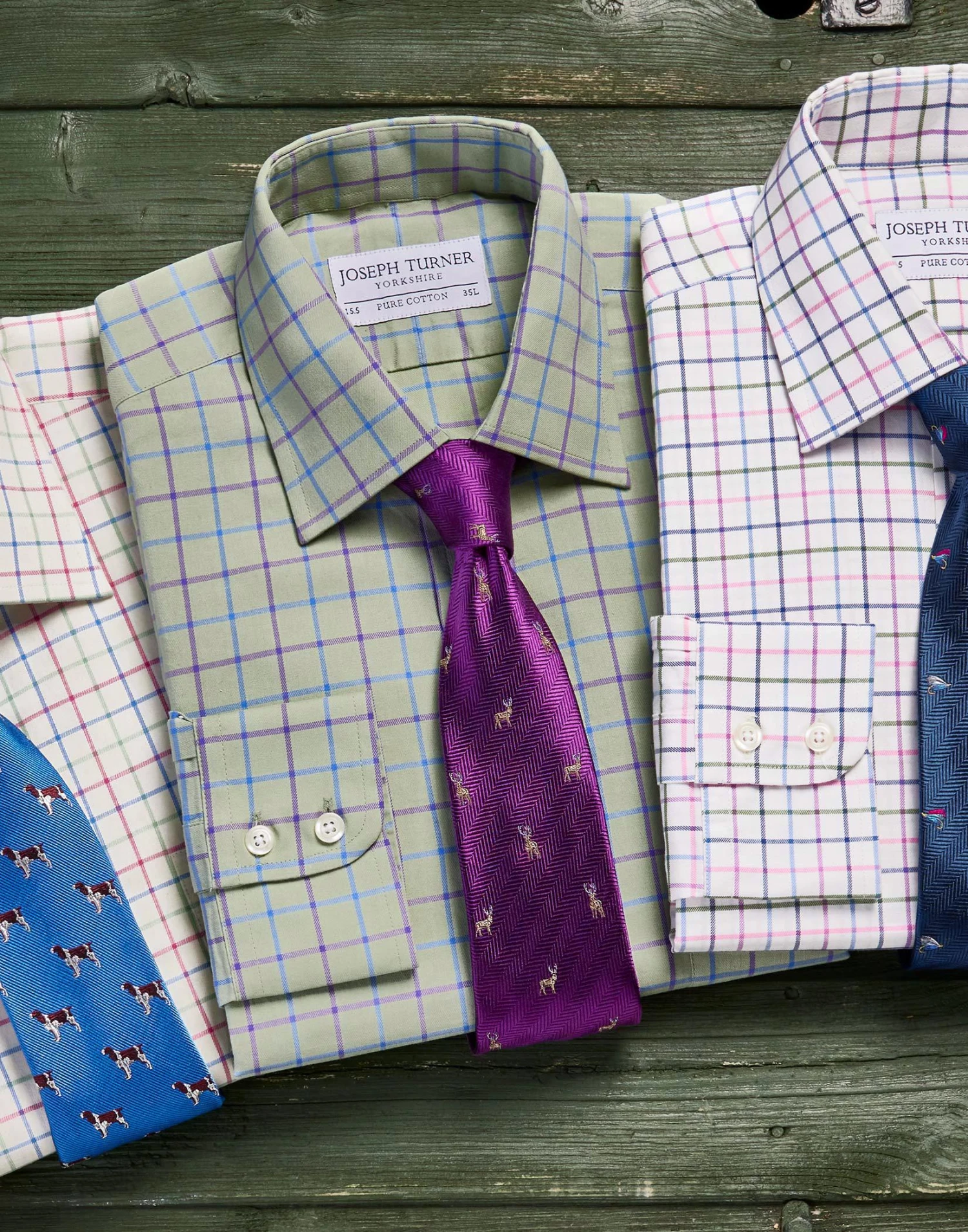 Our woven silk country ties are the perfect complement to our range of brushed cotton Tattersall check country shirts. Add a little personality to yours with this hand-finished pure silk tie featuring stags on a purple base.