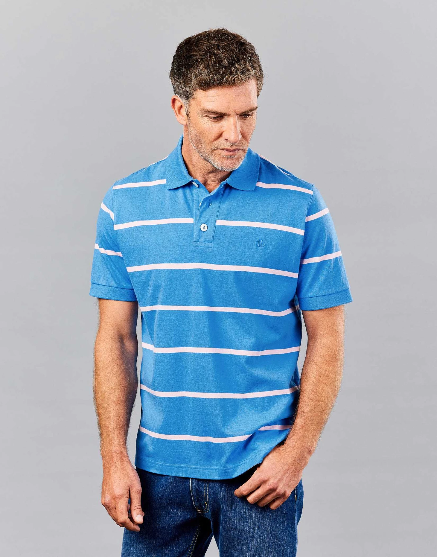 Add interest to chinos and shorts with one of our men’s striped polo shirts in blue & pink. Made from exceptionally soft pure cotton jersey these polo shirts combine style with comfort.