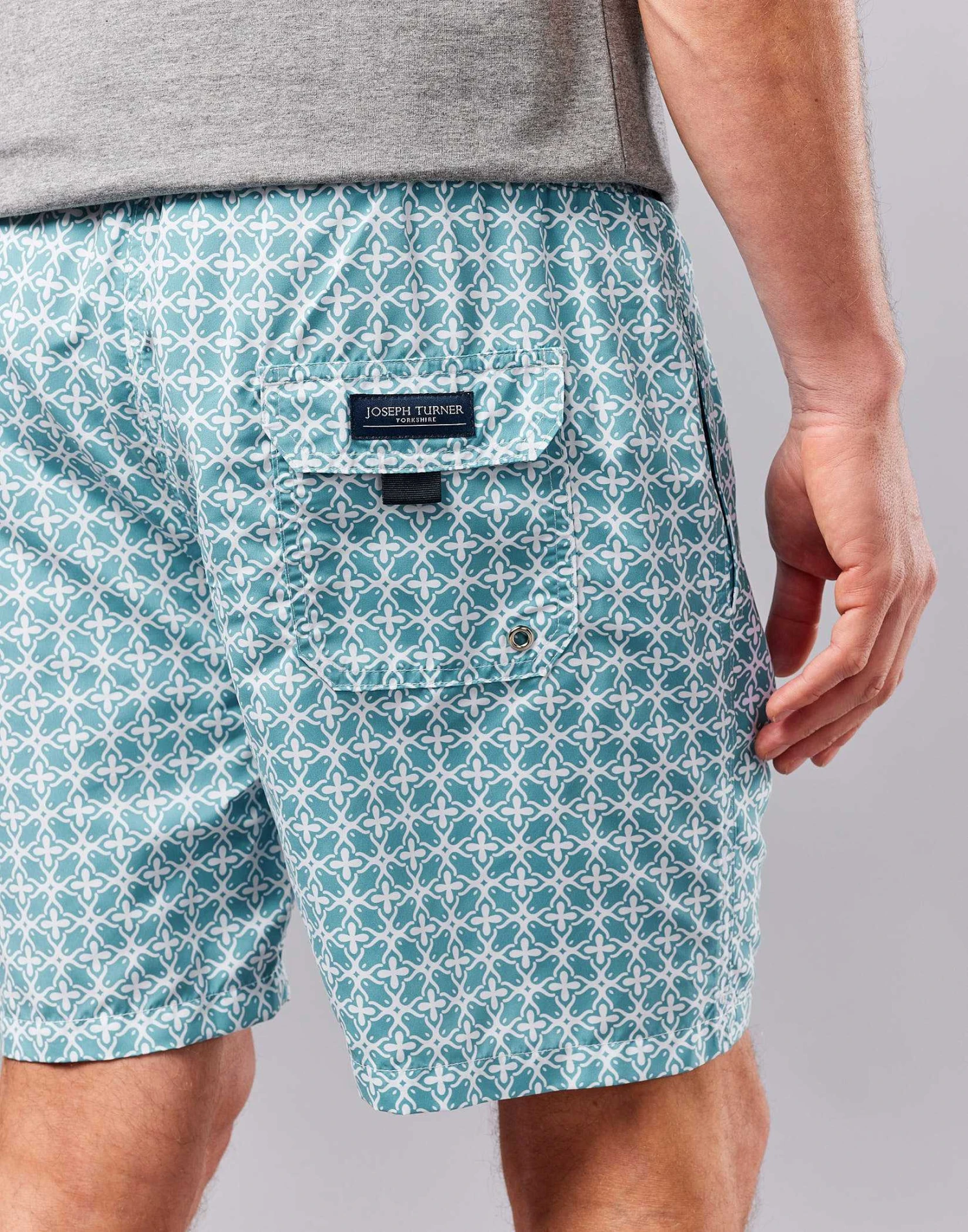 Make a splash with our sporty men’s swim shorts featuring two side pockets a back pocket and a drawstring waist. In a fresh ocean geometric design these stylish men’s swim trunks look great worn poolside or strolling along the beach.