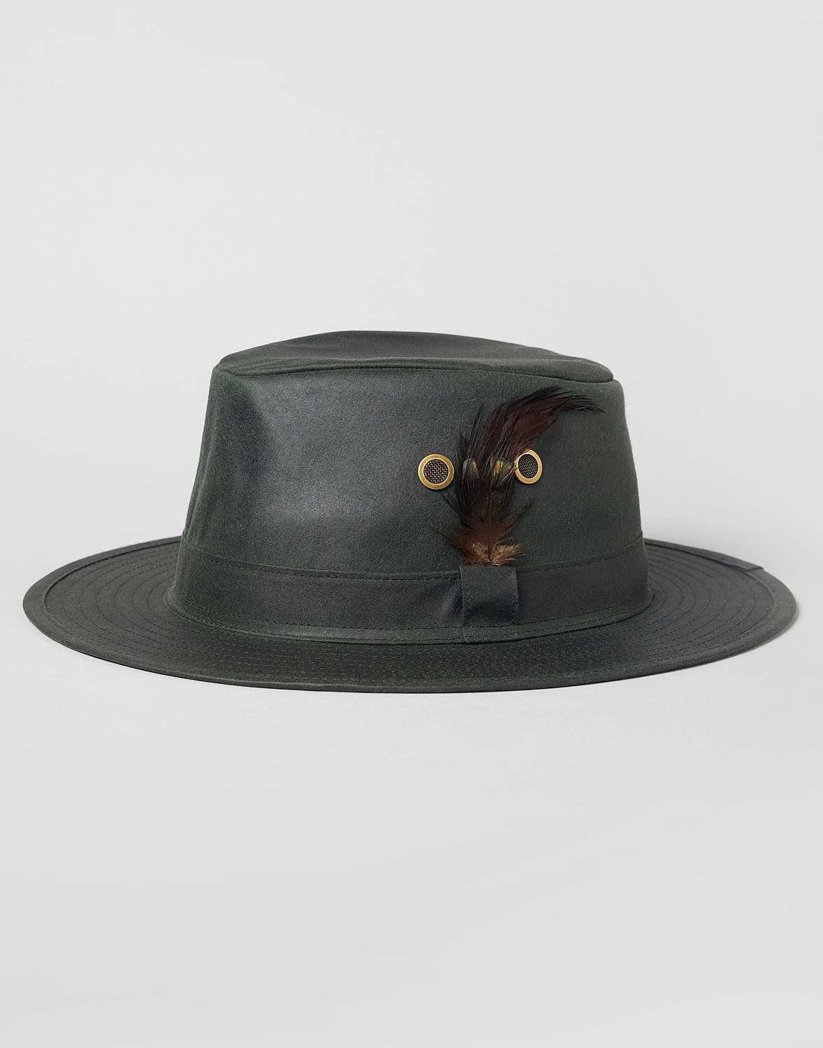 Made from water resistant Halley Stevenson waxed cotton our Trilby hats not only add a touch of sophistication to your outfit but also provide excellent protection from the weather. Fully lined for comfort and featuring a stylish feather mount this olive Trilby hat is a true British country classic.