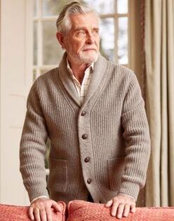 Discover our luxurious Whitby Rib Shawl Collar Cardigan meticulously crafted with a substantial 5-gauge knit using 100% lambswool. Indulge in ultimate comfort and warmth with its cosy design perfect for chilly days and cosy evenings. Layer over a brushed cotton shirt and pair of dark denim jeans for a laid-back yet stylish outfit. Complete with two convenient patch pockets this cardigan combines both functionality and style.