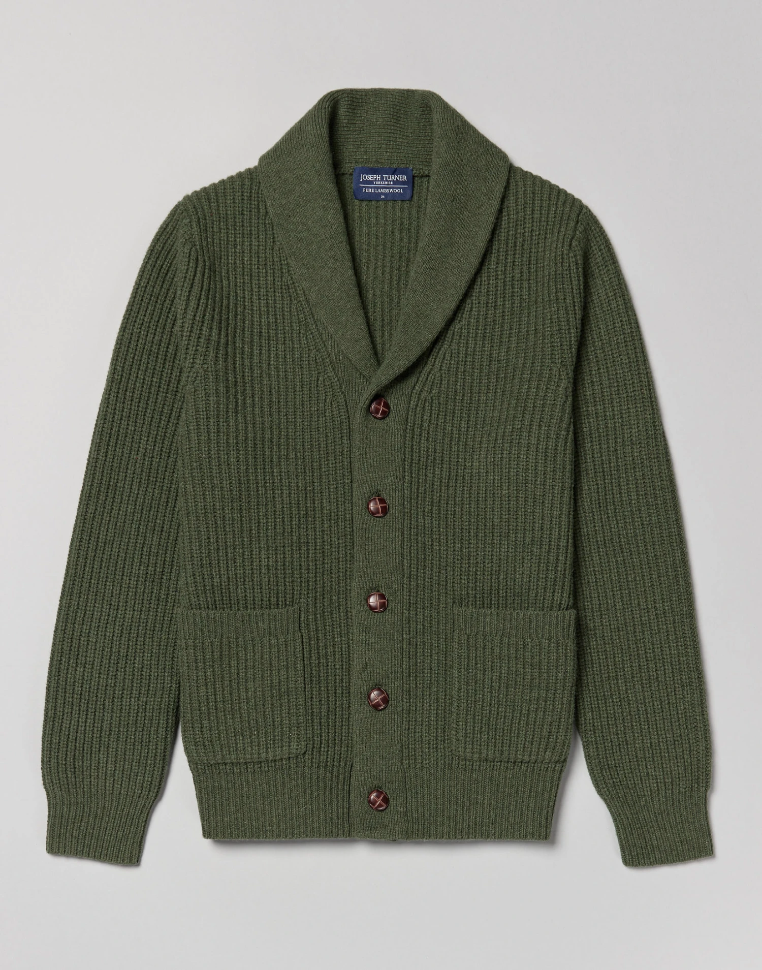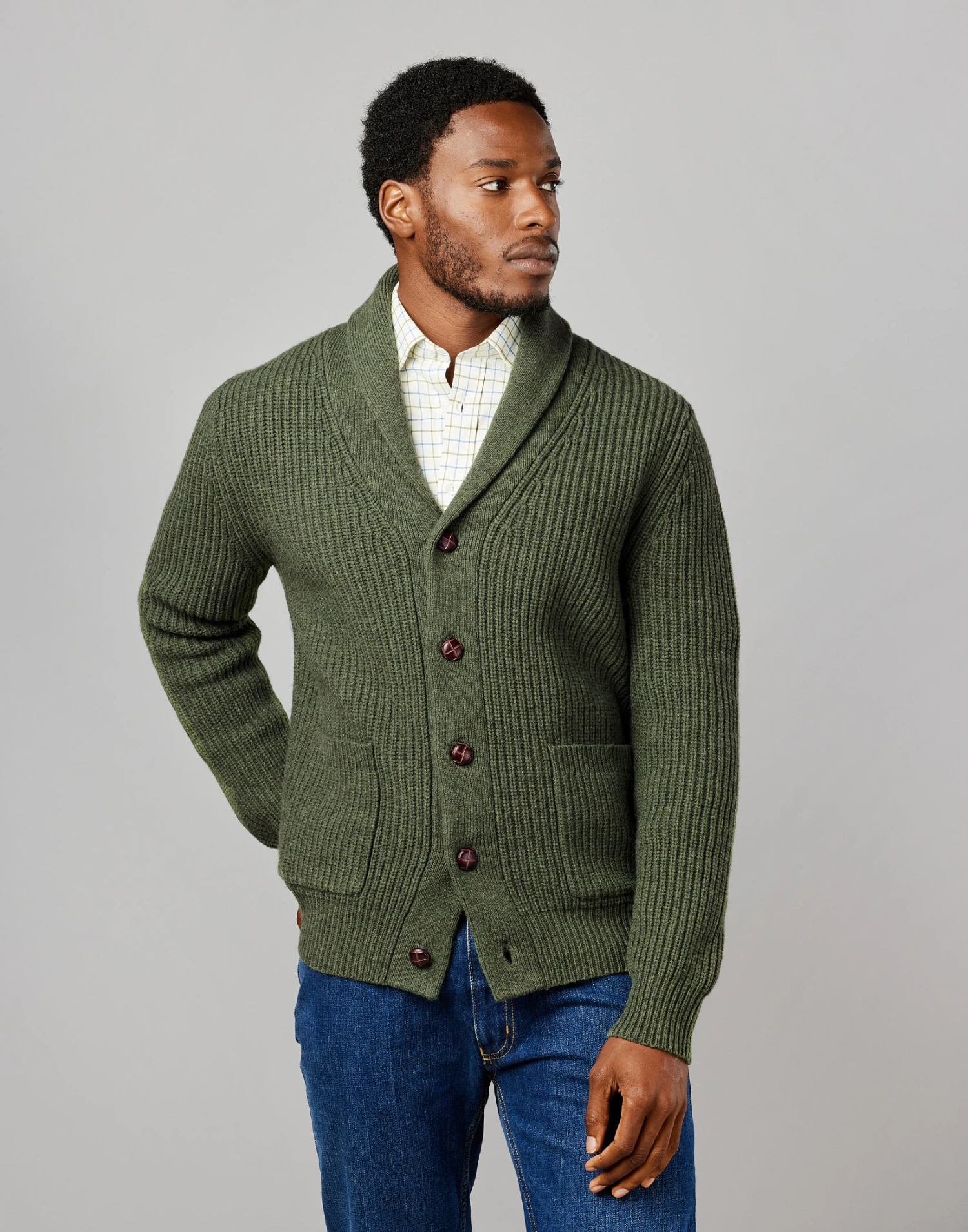 Discover our luxurious Whitby Rib Shawl Collar Cardigan meticulously crafted with a substantial 5-gauge knit using 100% lambswool. Indulge in ultimate comfort and warmth with its cosy design perfect for chilly days and cosy evenings. Layer over a brushed cotton shirt and pair of dark denim jeans for a laid-back yet stylish outfit. Complete with two convenient patch pockets this cardigan combines both functionality and style.